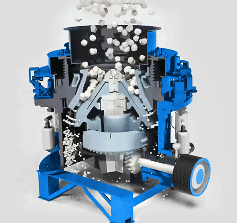 The movable core of crushers performs a rotary swing motion driven by the action of eccentric sleeve. This motion drives the mantles to squeeze and rub the material between the mantle and concave surface. According to inter-particles crushing theory, the material is subjected to forces from multiple directions, resulting in crushing and polishing that aligns with its own texture. Consequently, stable particles are formed. Particles that meet the discharge requirements are released from the swing gap between the mantles, while the remaining materials undergo continuous crushing until the desired particle size is achieved.